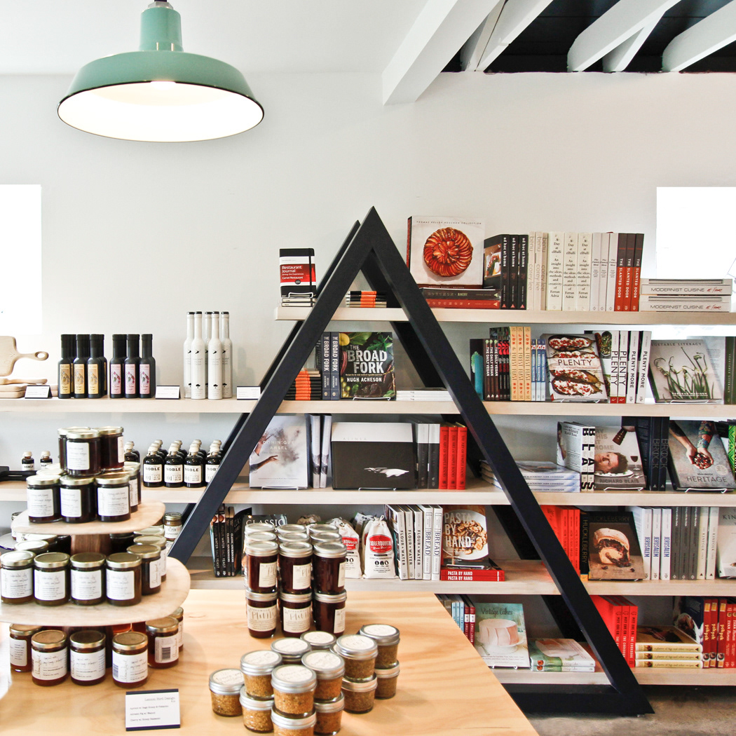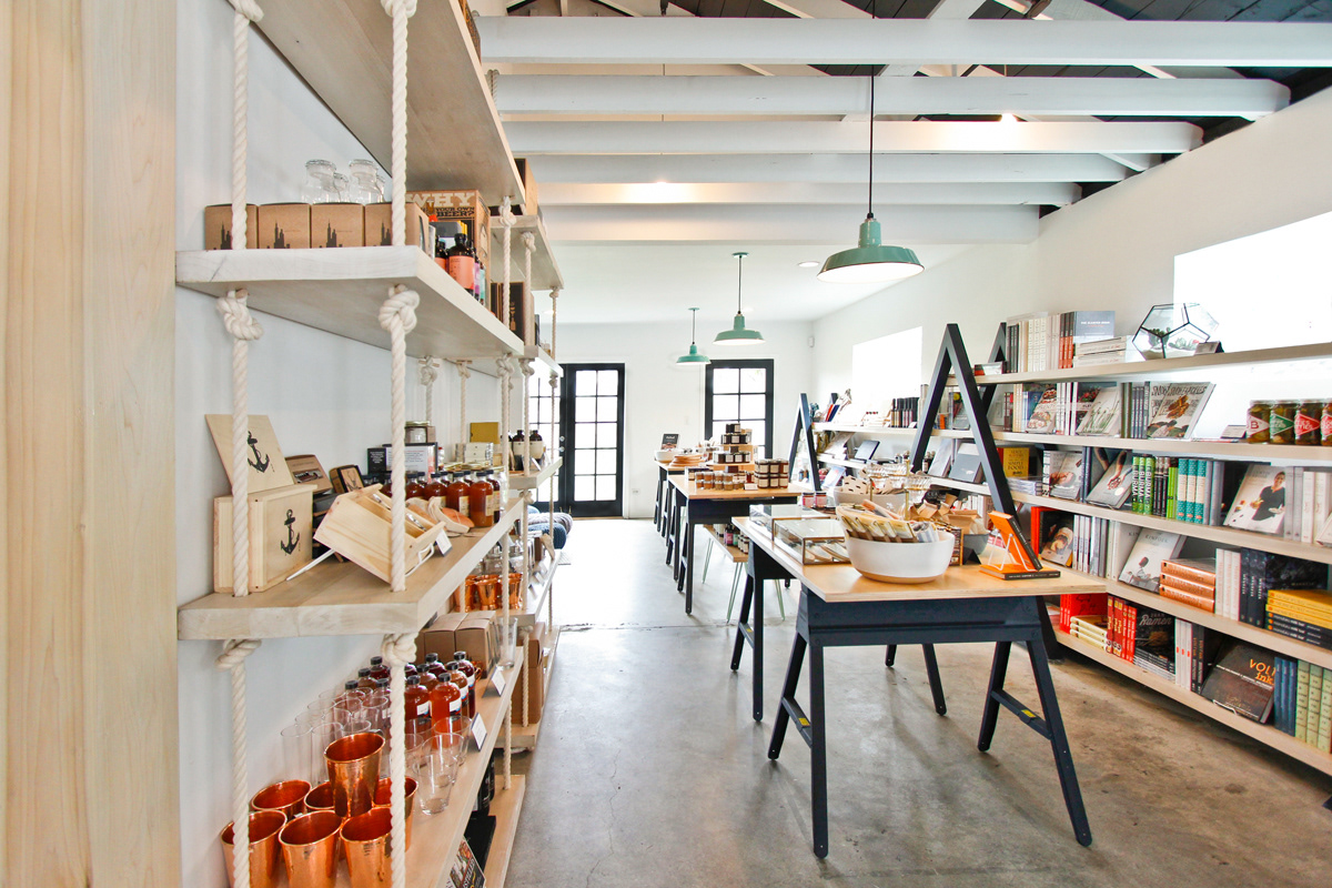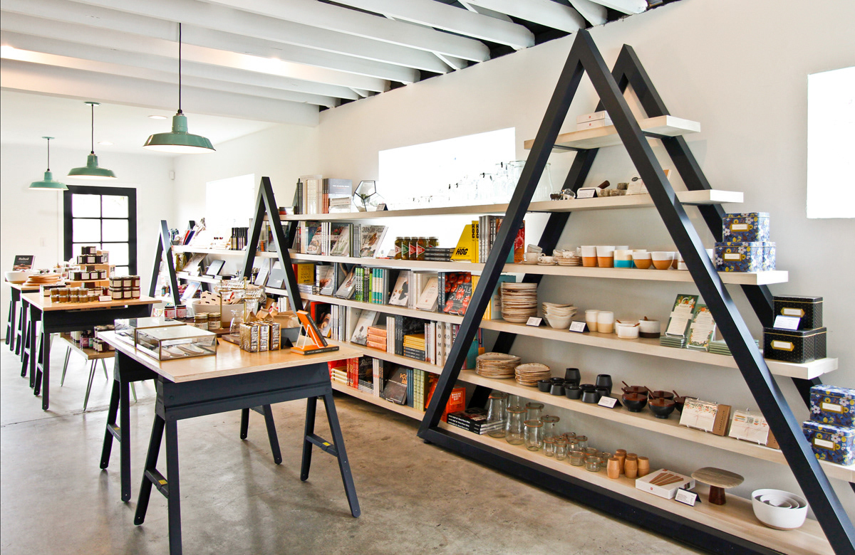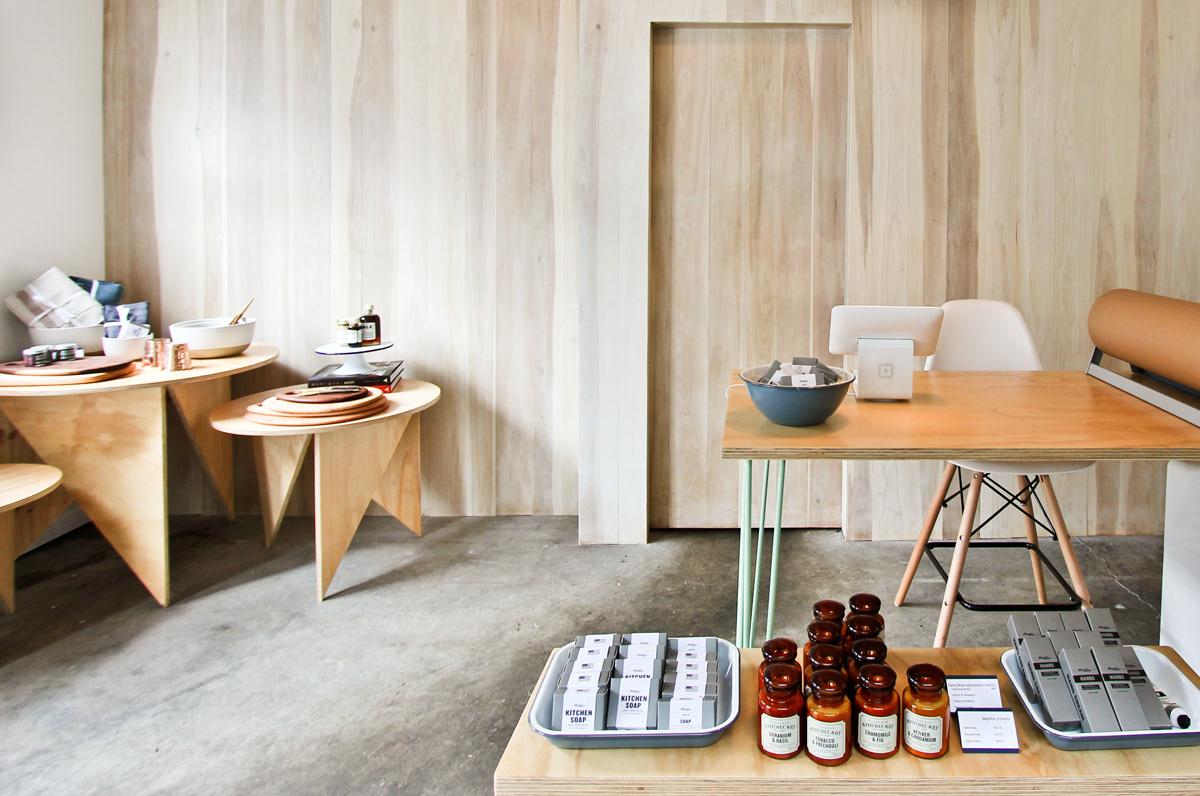 Project: Fabrication of display tables, benches, and shelving. Fabrication and installation of poplar accent wall. Interior design by Jill Stevens of Dust+Co.