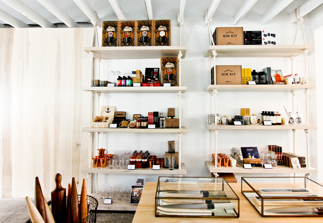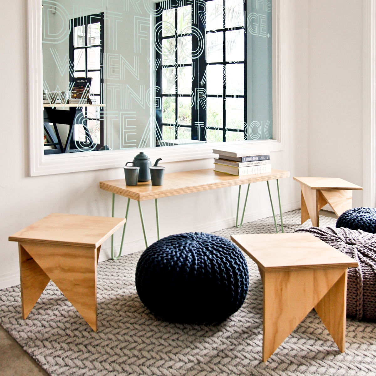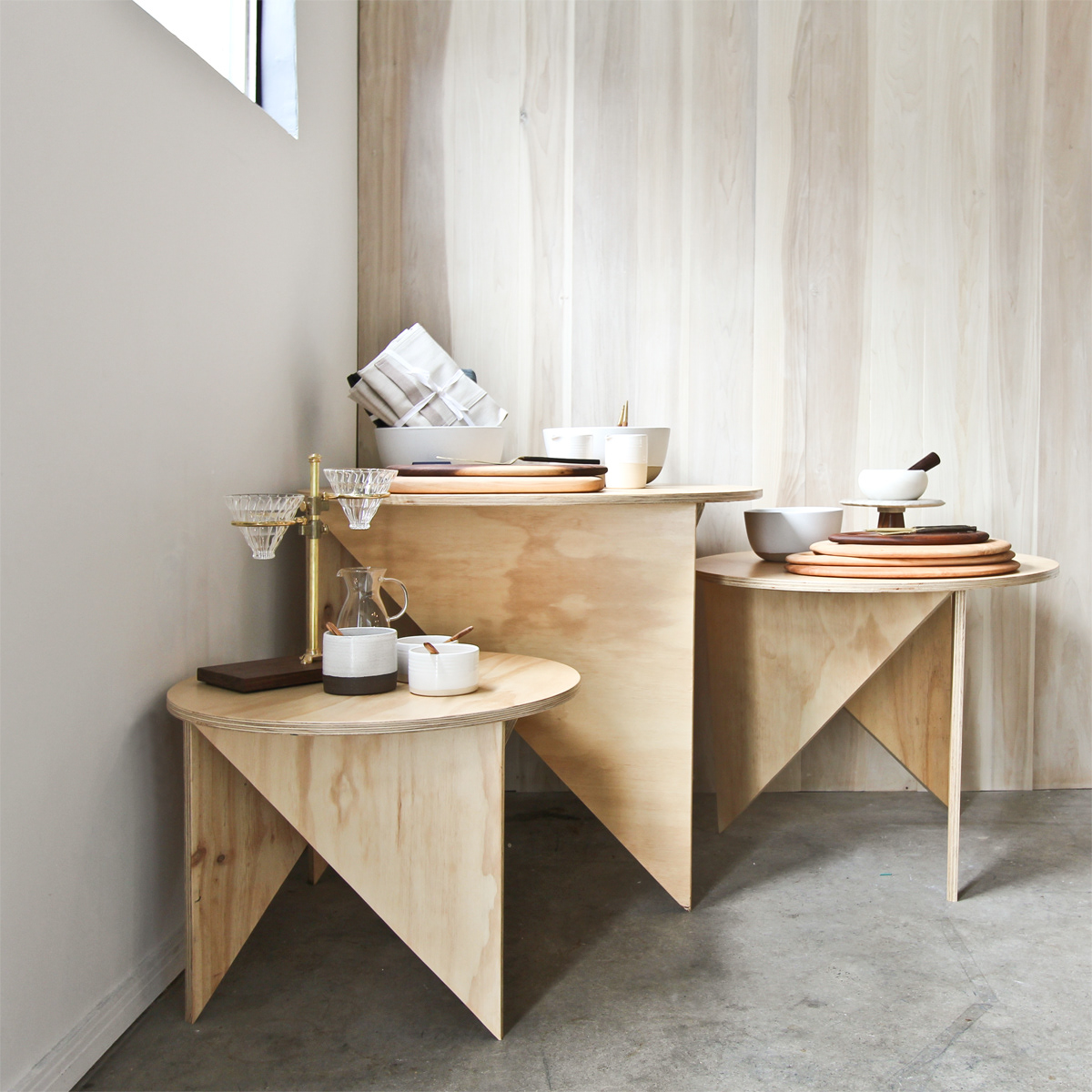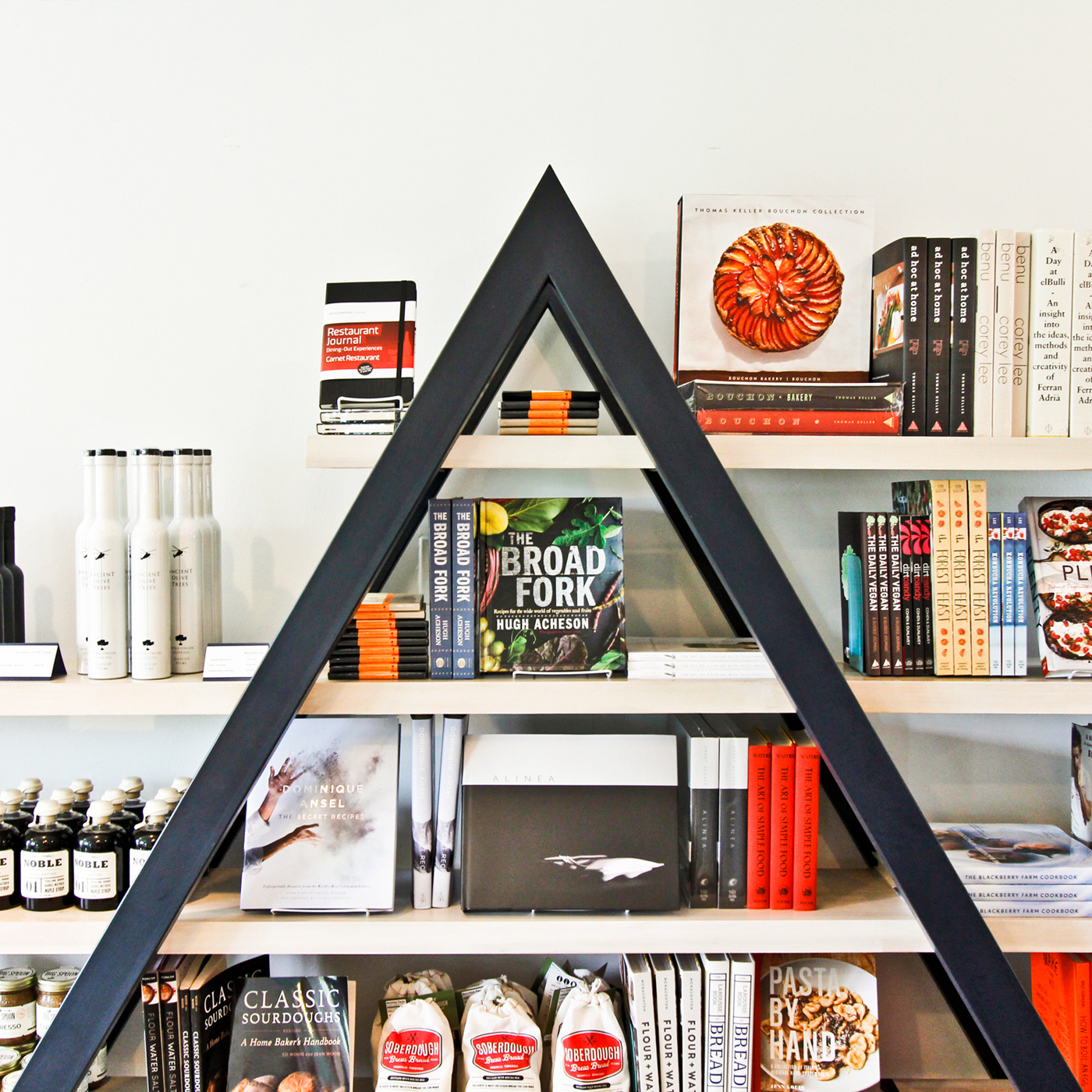 Project: Fabrication of display tables, benches, and shelving. Fabrication and installation of poplar accent wall. Interior design by Jill Stevens of Dust+Co.